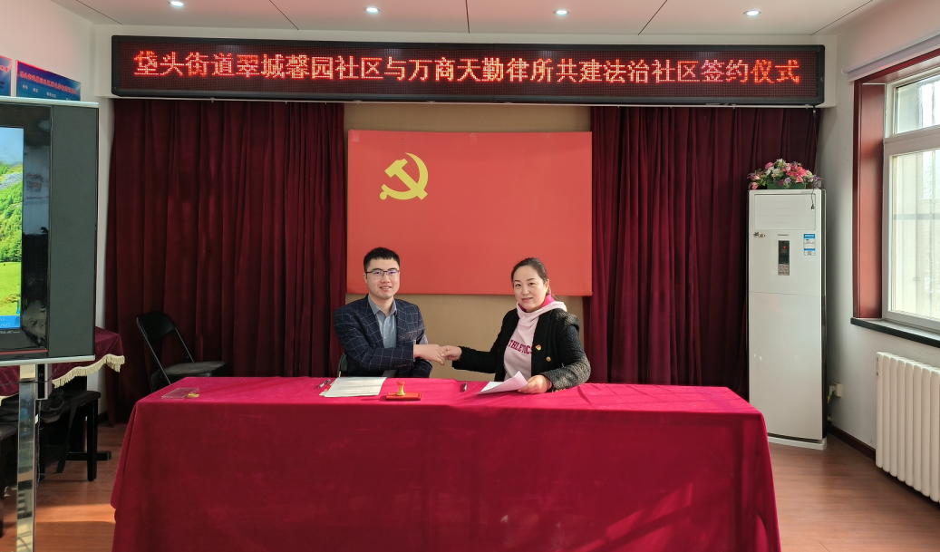 为全面贯彻落实上级党委关于“律师党员助社区、人民满意我先行”的指示精神,秉承“三民三共”公益服务理念,践行“人民律师为人民”的初心,助力社区治理和法治建设,2023年3月7日,万商天勤党总支第二党支部书记李浩律师与翠城馨园社区书记李玫同志就“结对子”党建活动方案进行洽谈,并正式签署合作协议书。