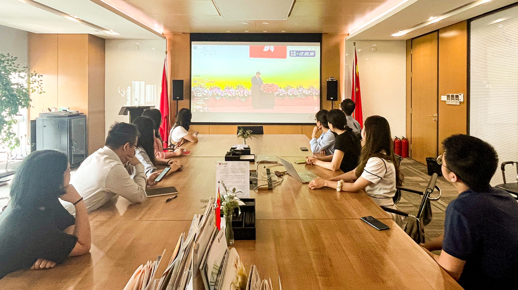 2022年7月1日,万商天勤党总支组织全体党员共同庆祝中国共产党建党101周年暨香港回归25周年,党总支书记陈冰梅同志与党员律师一起观看庆祝香港回归祖国25周年大会暨香港特别行政区第六届政府就职典礼直播,共同学习习近平主席重要讲话精神。