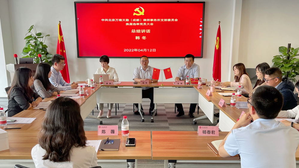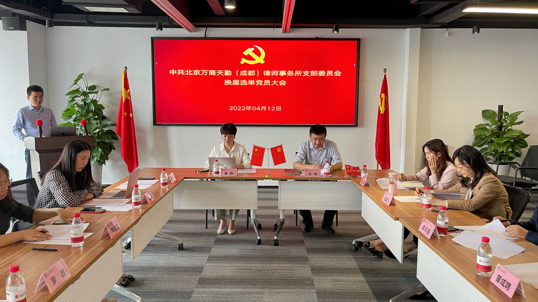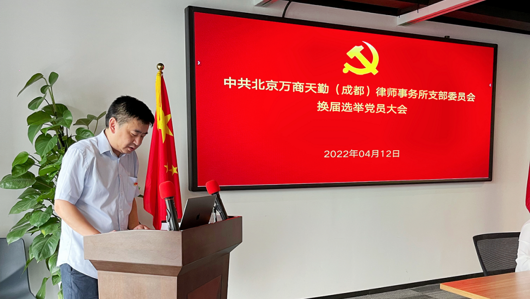 2022年4月12日,中共北京万商天勤(成都)律师事务所支部委员会换届选举党员大会于北京万商天勤(成都)律师事务所会议室召开,全所党员参加大会。大会由党支部副书记谢栋才律师主持。