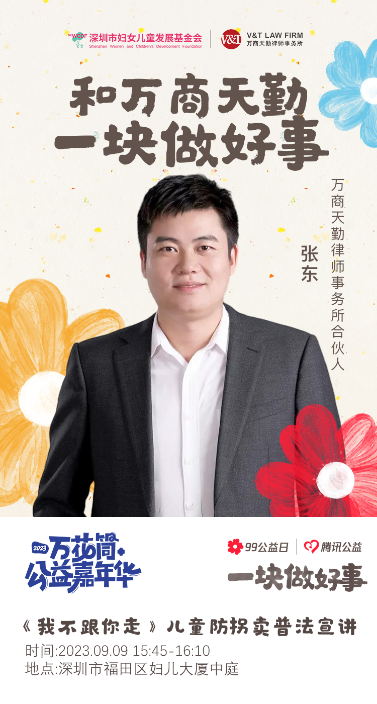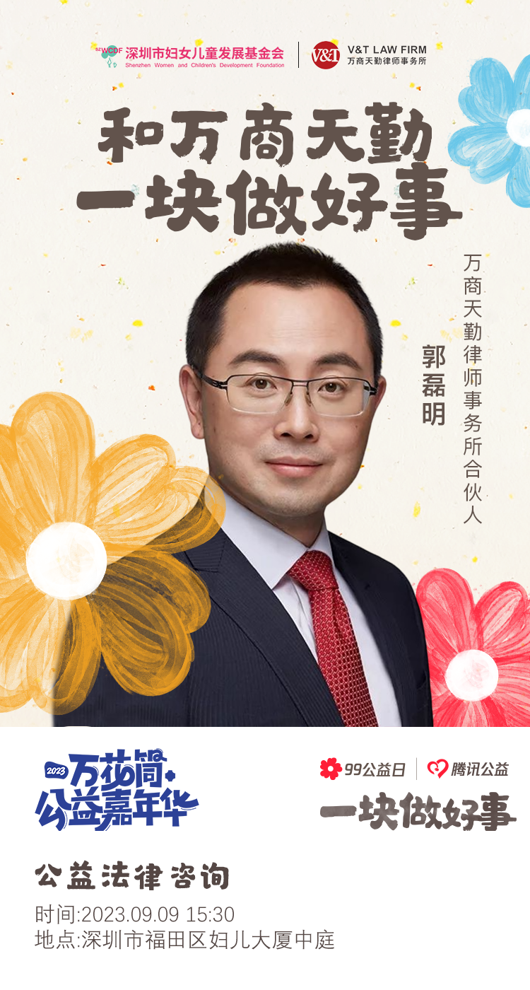 2023年9月9日,深圳市妇女儿童发展基金会、深圳市妇女社会组织促进会与万商天勤将在深圳妇儿大厦共同举办万花筒公益嘉年华,通过举行公益市集、音乐派对、普法宣讲等形式,向公众宣传公益项目,并号召劝募。万商天勤合伙人郭磊明律师、张东律师将作为爱心公益普法大使,为妇女儿童权益保障贡献力量,营造关爱妇女儿童的友好氛围,让爱心温暖更多的困境妇儿。
