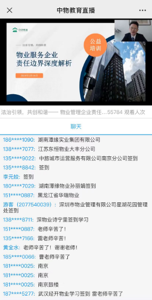 2024年5月16日,一场全国物业人心连心的公益培训于万商天勤深圳办公室圆满落幕,本次培训由万商天勤深圳办公室雷昭新律师主讲,中物教育联合辽宁、黑龙江、福建、河南、广西、海南、重庆、云南、甘肃等省级物协与房协,深圳、武汉、成都、石家庄、长春、南京、杭州、福州、长沙、唐山、秦皇岛、邯郸、邢台、沧州、大连、盘锦、无锡、苏州、扬州、宁波、厦门、三明、泉州、漳州、龙岩、德州、宜昌、荆州、黄石、荆门、东莞、惠州、韶关、柳州、遵义市物协,泉州南安市、泉港区、成都青白江区、咸阳秦都区物协等48家合作伙伴共同举办,当日超过5.8万名物业专业人士通过线上直播平台积极参训,共同探讨了物业服务责任边界的细化与明确。此次跨地域的直播活动不仅促进了行业知识的共享,也为解决物业管理中的责任界定难题提供了交流平台,有力推动了物业服务行业的高质量发展。