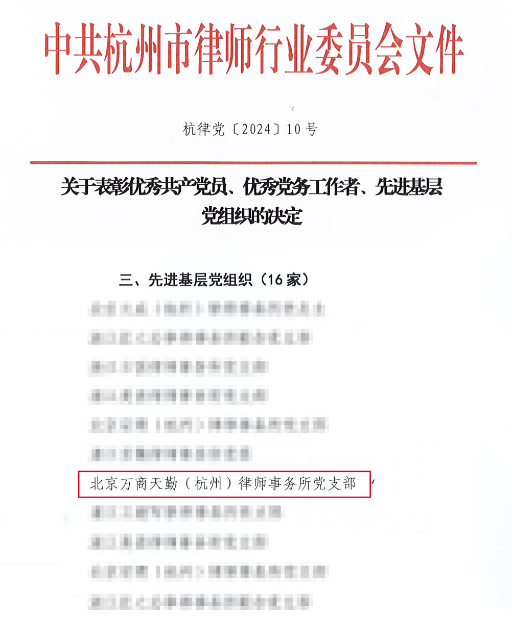 在中国共产党迈进103周年华诞的光荣时刻,杭州市律师行业协会对表现杰出的个人与集体予以表彰。其中,“优秀共产党员”、“优秀党务工作者”以及“先进基层党组织”名单正式揭晓,万商天勤杭州办公室党支部获得“先进基层党组织”荣誉称号。