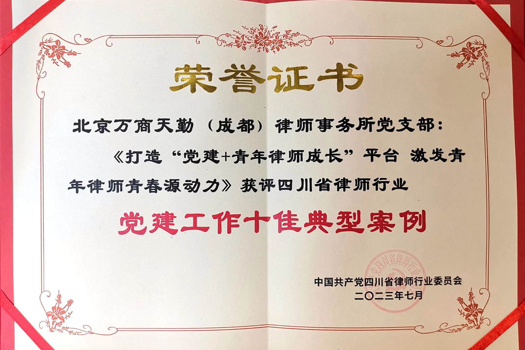 谢栋才律师此次获得表彰,既是组织上对其个人的褒奖,也是省、市、区律师行业党委对万商天勤成都办公室党建工作的肯定。近年来,成都办公室党支部先后荣获成都市律师行业“服务大局‘冲锋党组织’ ”“先进党组织”、“省律师行业党建标准化律师事务所党组织”、四川省律师行业“先进基层党组织”“党建工作十佳案例”等多项荣誉。