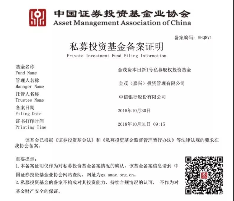 2018年10月30日,金茂(嘉兴)投资管理有限公司管理的“金茂资本日新1号私募股权投资基金”(以下简称“日新1号基金”)在中国证券投资基金业协会成功备案,基金编号SEQ871。万商天勤北京办公室高磊律师、谭凯律师为日新1号基金的募集及备案提供全过程法律服务,协助客户高效完成了基金协议的起草、谈判、修改、完善,以及全套备案文件准备工作,成功助力日新1号基金在较短时间内完成备案。本项目还得到了万商天勤北京办公室孙涛律师、魏洁律师及崔凯律师助理的大力支持。