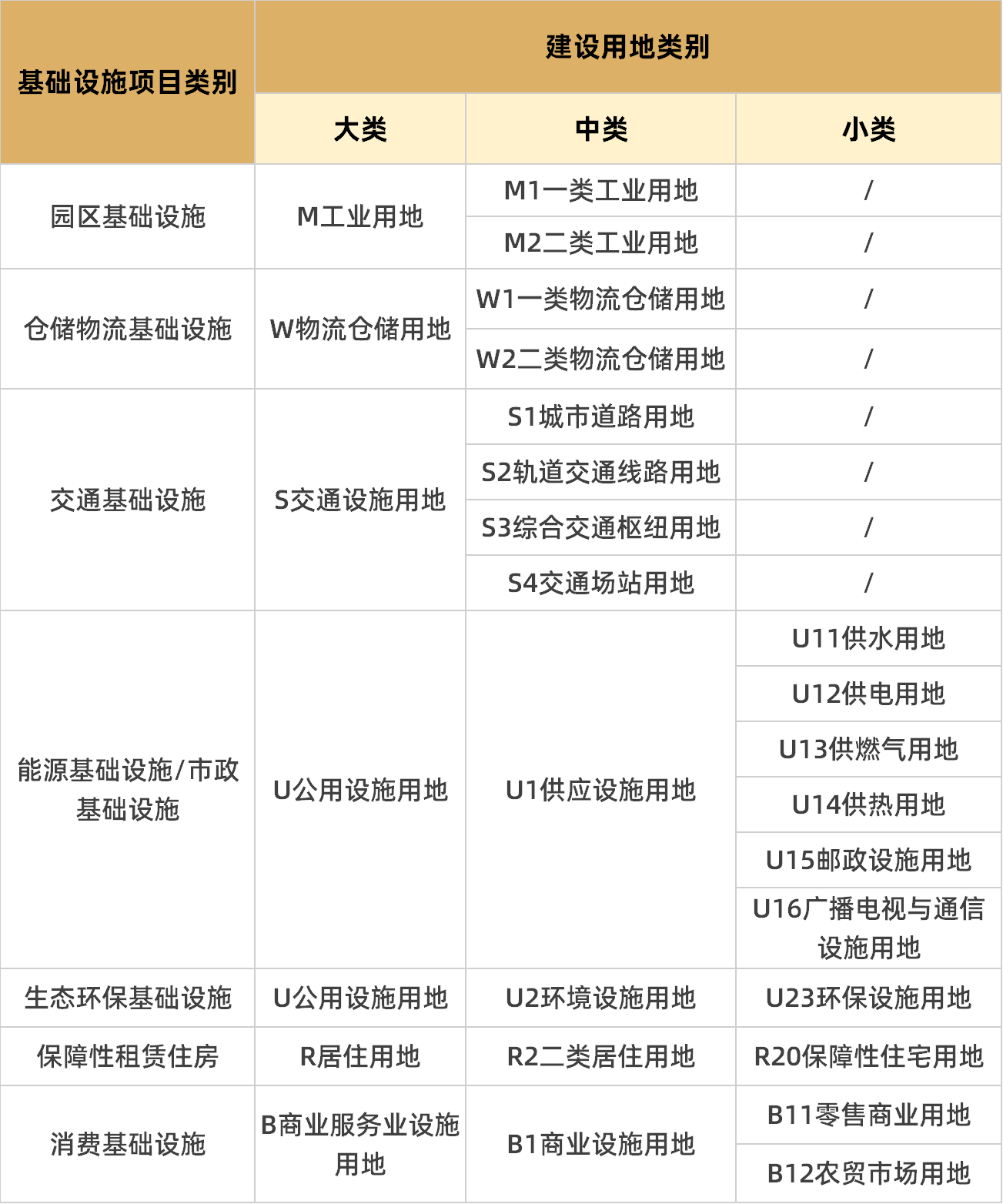 我国实行土地用途管制制度,国家编制土地利用总体规划和城乡规划,严格土地用途管制。土地用途变更“牵一发而动全身”,使用土地的单位和个人必须严格按照土地利用总体规划确定的用途使用土地,《土地管理法》第八十一条规定“不按照批准的用途使用国有土地的,由县级以上人民政府自然资源主管部门责令交还土地,处以罚款”。《土地管理法》自1986年施行历经多次修改,因此在Pre-REITs项目投资法律尽调过程中,首先需要按照项目公司获取土地使用权时当时有效的法律法规和土地政策审查基础设施项目用地的合规性。按照《城市用地分类与规划建设用地标准》(GB50137-2011),各类基础设施用地分类主要涉及以下土地类别: