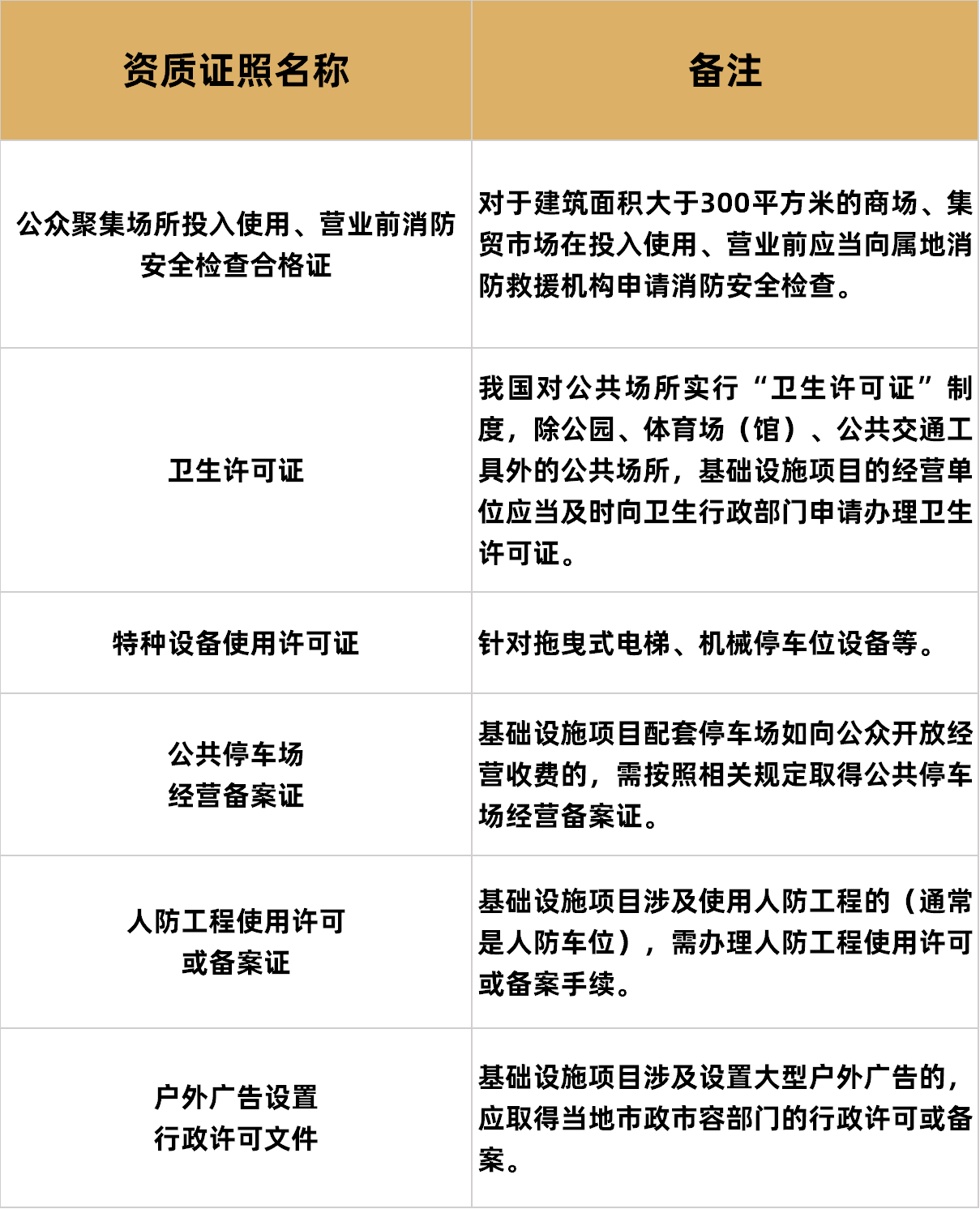 沪深交易所《公开募集基础设施证券投资基金(REITs)规则适用指引第1号——审核关注事项(试行)(2023年修订)》中要求基础设施资产涉及经营资质的,相关经营资质或者经营许可应当合法、有效。不同基础设施项目的经营资质差异较大,以消费基础设施为例,项目公司运营消费基础设施项目需要取得的相关资质或许可主要有: