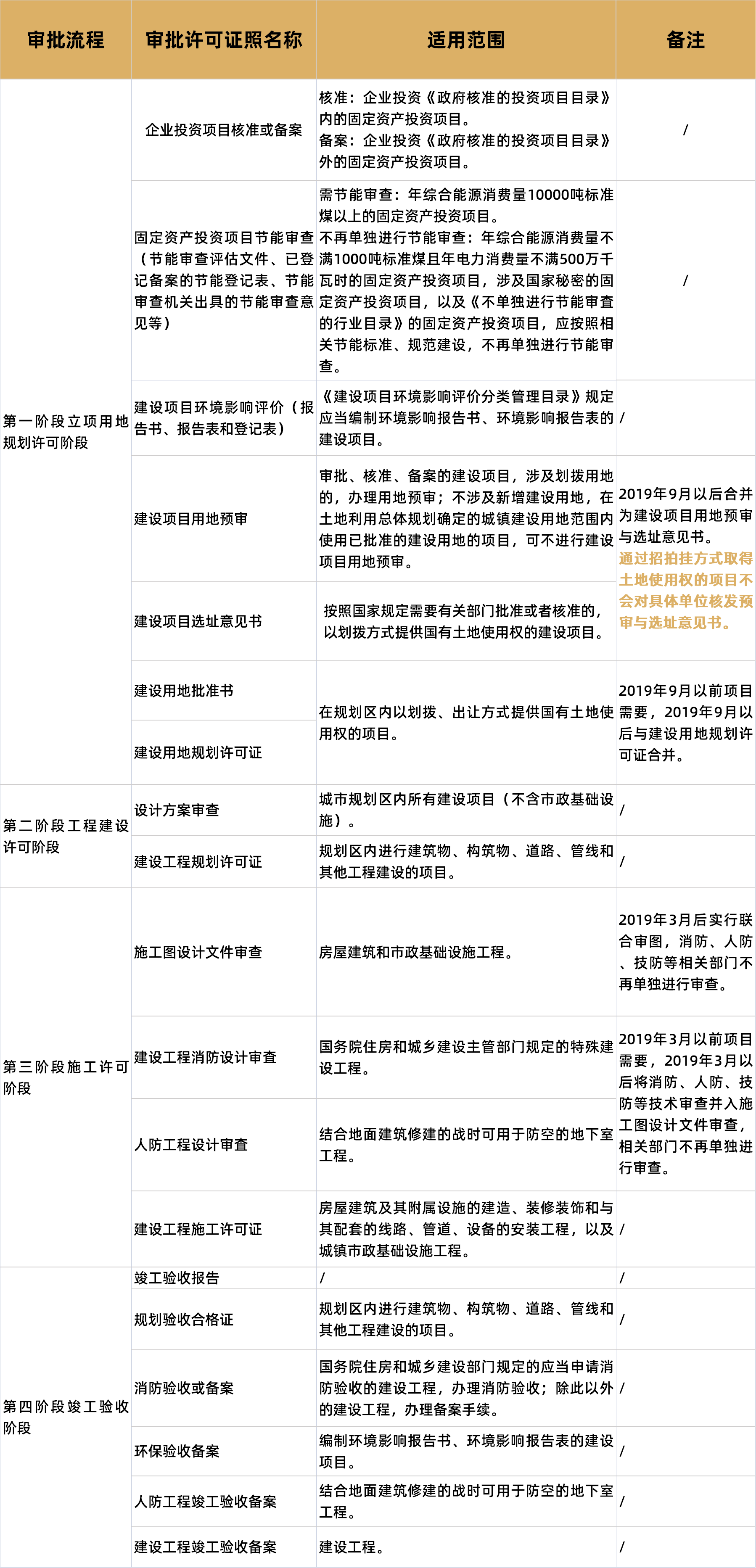 根据沪深交易所分别制定的《公开募集基础设施证券投资基金(REITs)规则适用指引第1号——审核关注事项(试行)(2023年修订)》,基础设施项目应当符合下列条件:基础设施资产已通过竣工验收,工程建设质量和安全标准符合相关要求,原则上已按照投资建设时的规定履行规划、用地、环评等审批、核准、备案、登记以及其他依据法律法规应当办理的手续。基础设施项目建设合规性的判断依据乃投资建设时的法律法规,而我国工程建设项目审批制度在深化改革的大背景下亦在不断改革和优化,《国务院办公厅关于全面开展工程建设项目审批制度改革的实施意见》(国办发〔2019〕11号)将工程建设项目审批流程主要划分为立项用地规划许可、工程建设许可、施工许可、竣工验收四个阶段,实行联合审图和联合验收。该制度对既有工程建设项目审批流程进行了总结,同时按此四个阶段对审批流程进行了一定的优化。以2019年为划分时点,可以按此四个阶段对基础设施项目国有建设用地及建设所需获得的审批整理如下: