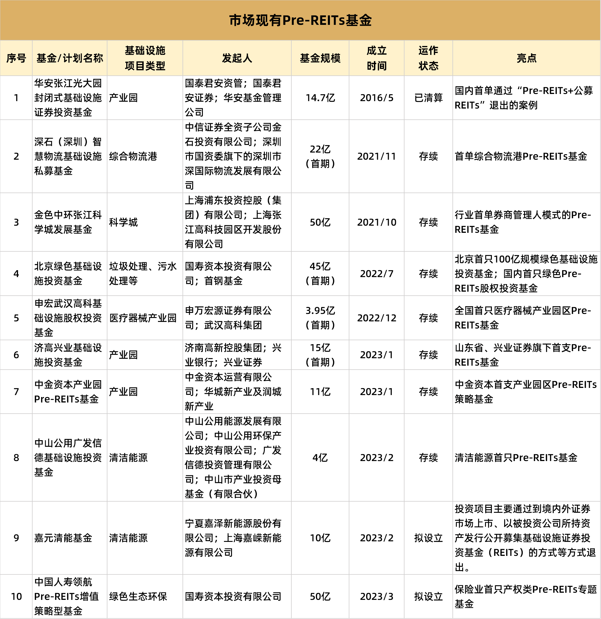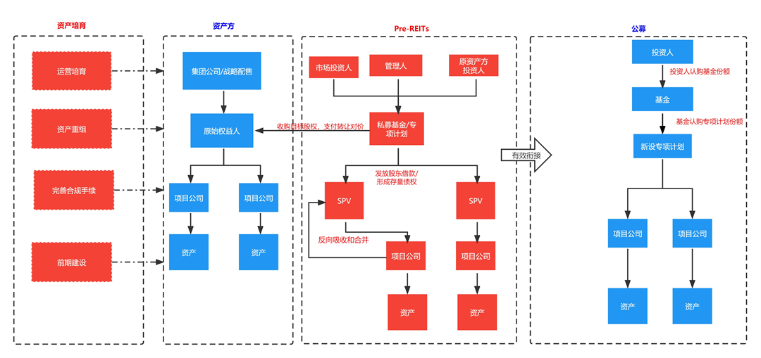 Pre-REITs目前暂无准确的法律定义,我们认为,以公募REITs作为退出路径,比照基础设施领域不动产投资信托基金(REITs)项目要求对项目进行筛选和提前介入标的资产的建设、运营和培育过程的,以获取二级市场溢价为投资目的的基金、资产支持专项计划乃至资管产品,均可视为Pre-REITs。在不动产私募投资基金试点推出前,常见形式为私募基金及资产支持专项计划。