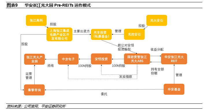 下图为来自平安证券研究所的华安张江光大园Pre-REITs运作模式: