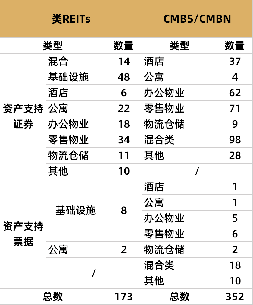 截至2023年4月23日,已发行类REITs共有173只,其中资产支持证券类REITs163只,资产支持票据类REITs10只;已发行CMBS/CMBN共有352只,其中CMBS309只,CMBN43只[v]。