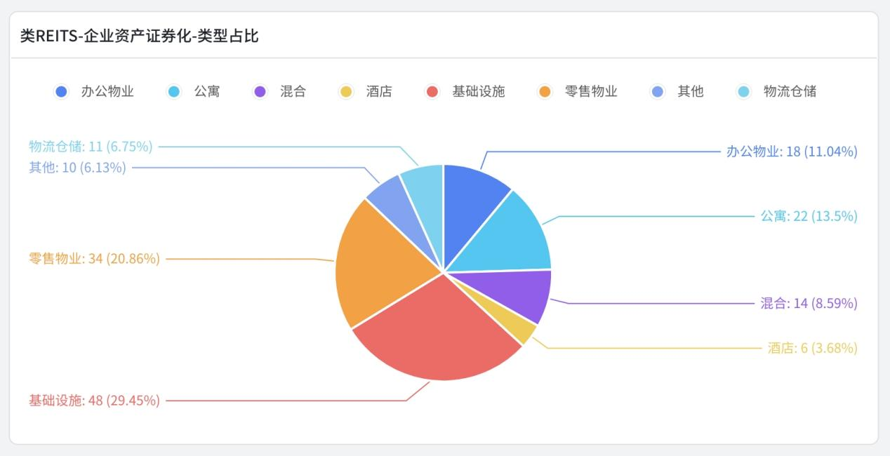截至2023年4月23日,在已发行的173只类REITs中,底层资产类型包括基础设施(50只)、酒店(6只)、公寓(24只)、办公物业(18只)、零售物业(34只)、物流仓储(11只)以及其他(10只)。