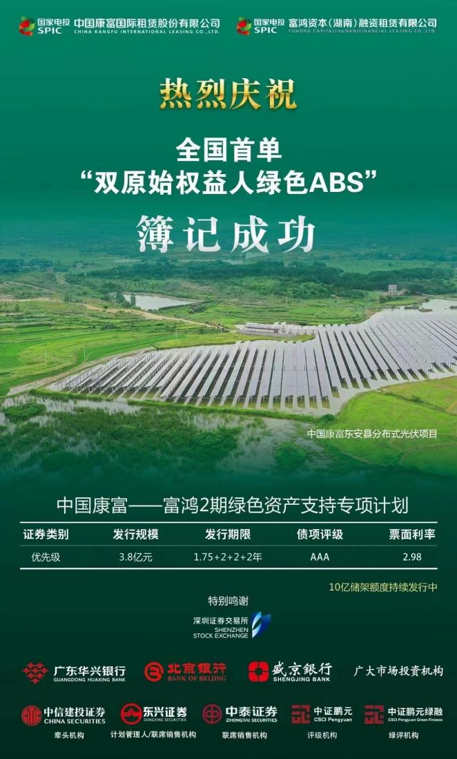 近日,中国康富国际租赁股份有限公司(以下简称“中国康富”)和富鸿资本(湖南)融资租赁有限公司(以下简称“富鸿资本”)在深圳证券交易所成功发行中国康富—富鸿2期绿色资产支持专项计划项目(以下简称“本项目”)。本项目为全国首单“双原始权益人绿色ABS”,发行规模为3.8亿元、期限为1.75+2+2+2年、发行票面利率为2.98%。