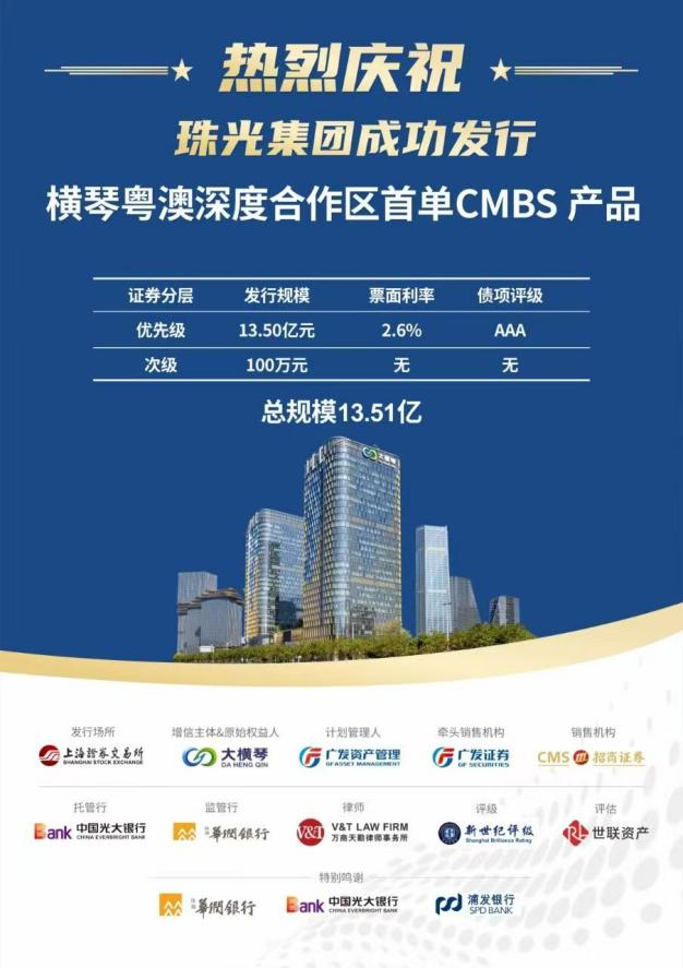 该项目是横琴粤澳深度合作区首单不动产资产支持证券(CMBS)产品,也是珠光集团的首单CMBS产品,实现了横琴粤澳深度合作区资本市场创新融资领域“零的突破”。